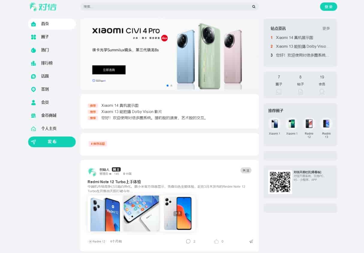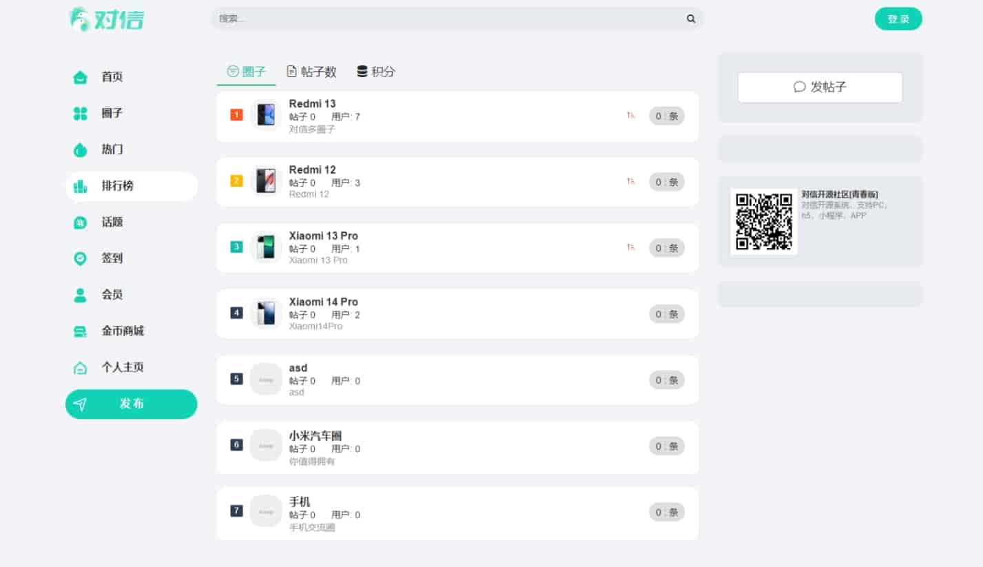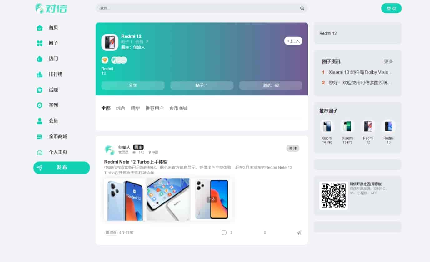简介:对信系统是一款开源的PHP建站系统,是“多圈”建站系统。专业为产品打造多圈社区,可搭建社区,问答,商城,有pc端,h5,微信小程序,百度小程序。基于商业开源,100%开源,可以商用。