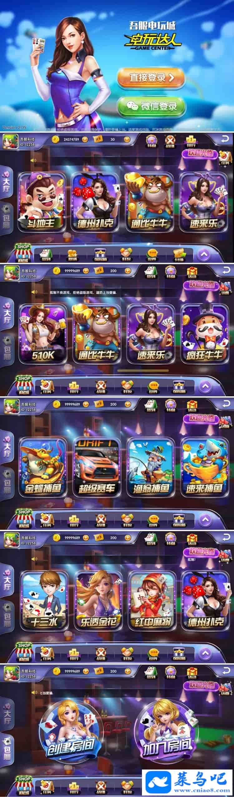 本次发布的速来棋牌游戏分别为1.62以及2.04版本,程序组件包含:服务端、客户端、网站、工具、机器人模块、数据库,集成聚宝云支付接口,属于泊众的内核开发,运营级棋牌游戏全部游戏均可控制,内含金币和包房场,这是运营级别棋牌游戏,支持微信登陆,签到,聊天公告 ,世界聊天,好友互动等一系列功能。