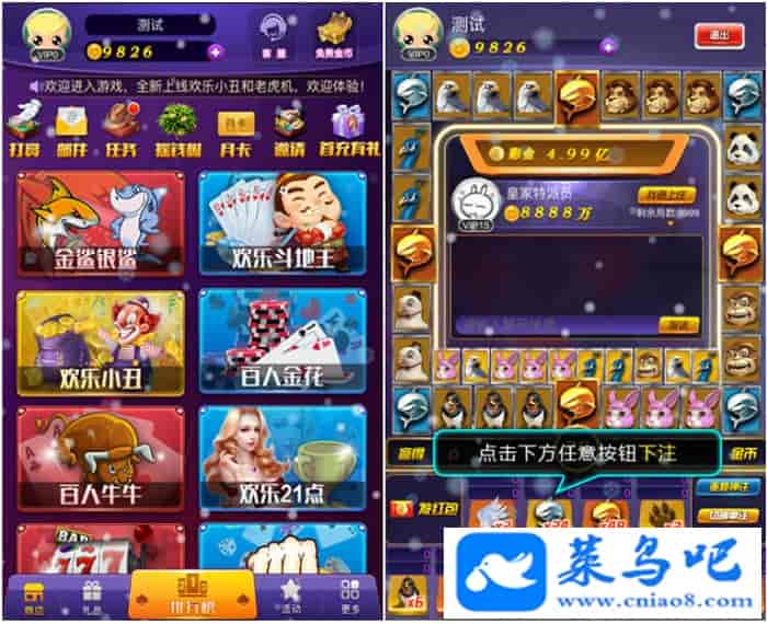 运营级H5产品,电玩城房卡版游戏合集,具有超强后台控制输赢,内含有8款:金鲨银鲨、斗地主、欢乐小丑、百人金花、百人牛牛、欢乐12点、水果机、PK游戏,源码附带有部署教程文档。