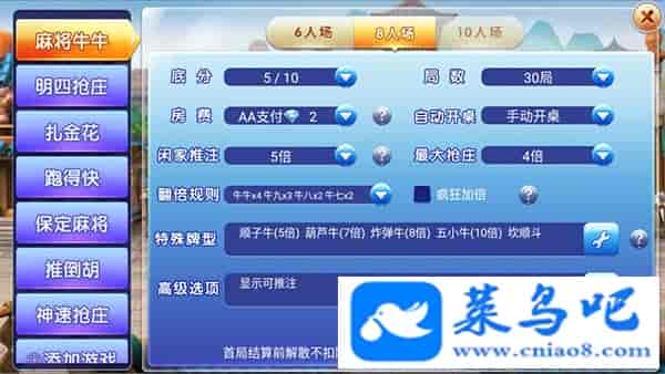 游戏方面:六人场、八人场、十人场、麻将牛牛、明四抢庄、炸金花、跑得快、保定麻将、推倒胡、神速抢庄