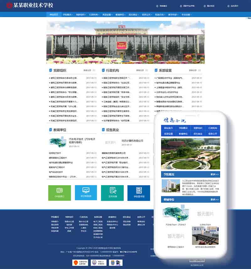 织梦最新内核开发的模板,该模板属于学院、学校、院校类企业都可使用,这款模板使用范围极广,不仅仅局限于一类型的企业,你只需要把图片和产品内容;换成你的,颜色都可以修改,改完让你耳目一新的感觉!自带最新的手机移动端,同一个后台,数据即时同步,简单适用!原创设计、手工书写DIV+CSS,完美兼容IE7+、Firefox、Chrome、360浏览器等;主流浏览器;页面简洁简单,容易管理,DEDE内核都可以使用;附带测试数据!模板特点: