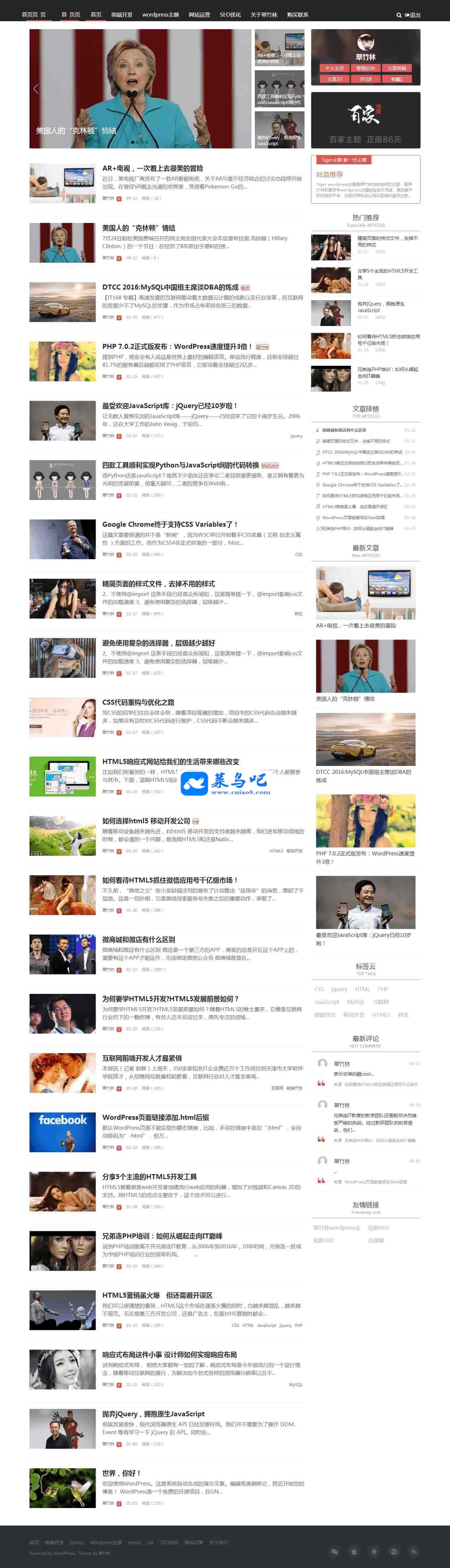 6.右侧栏强大的小工具如:特别推荐,根据评论的热门推荐,随机推荐,最新文章,根据浏览量文章排行榜,标签云,最新评论,友情链接等等。7.网页底部是二级导航,版权信息,二维码信息
