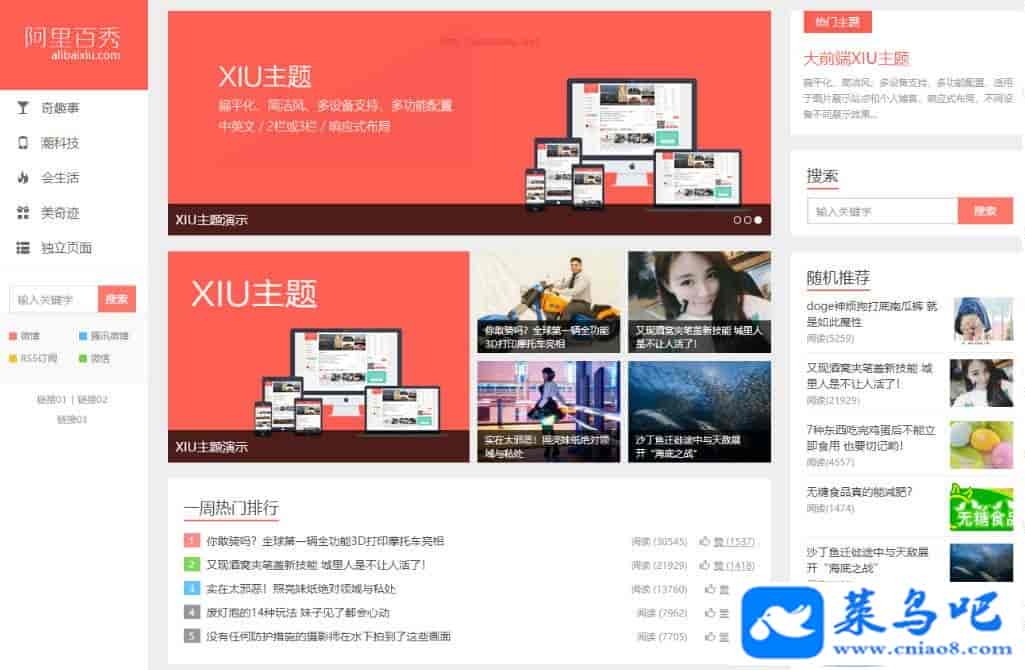 XIU主题是一款WordPress主题,支持百度熊掌号,适用于图片展示、多元化图片新闻展示、个人博客、资源分享站,扁平化设计、简洁风、全面SEO优化、多重列表展示方式 ,响应式布局支持电脑、平板和手机的完美展示。