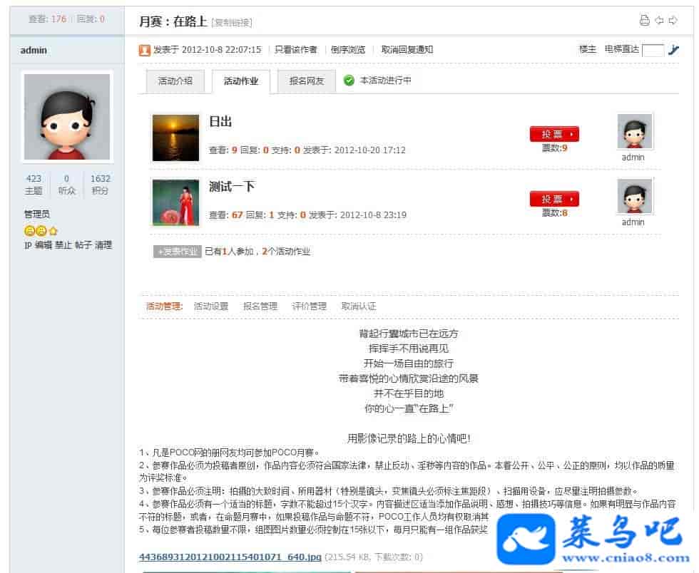 7、活动作业贴会自动聚合在活动召集的主题贴里,还可以设置对活动作业的投票,非常适用于一些评选活动。
