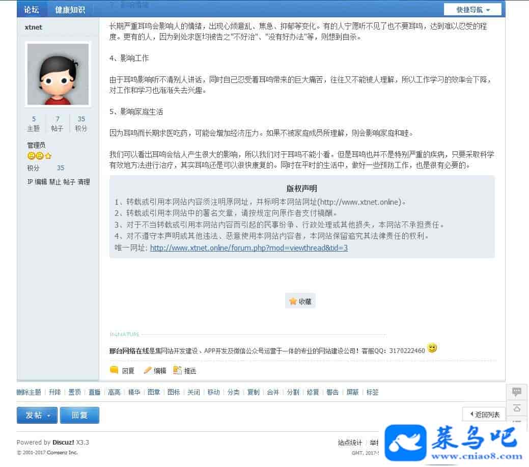 本插件可以在论坛帖子或者门户文章底部显示一个版权声明,支持门户、论坛和手机版,用于注明网站与会员之前的权利与义务。如今关于网络版权的纠纷越来越多,在网站上加上这个版权声明,可以避免很多潜在的纠纷,保护好网站的权益。