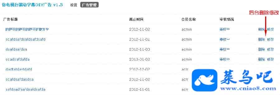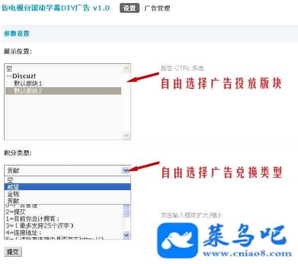 让用户可以通过积分进行论坛滚动字幕广告的购买与投放,管理员可以设置投放版块范围与会员购买广告的积分类型。从此,让会员的积分有地方可以消费使用,同时也能增加网站的收入。