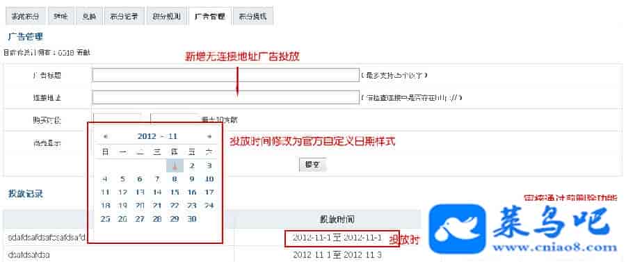 3.新增广告投放后,未通过审核前会员可以自行删除并返还积分的功能。