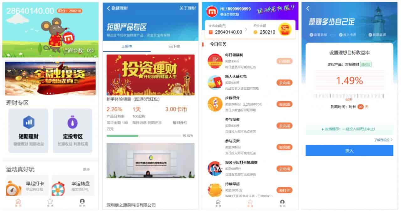 源码说明本套源码投资理财模式全面,支持定投短投和余额宝收益等,运营模式多样化,支持运动步数奖励,积分兑换,幸运转盘,新人红包,早起打卡,每日福利等,自带积分商城和广告接口,已经对接广告联盟,已对接个人免签支付,支持微信支付宝双通道,推广模式和商业变现非常成熟,已经形成一套完整流程,搭建以后即可快速上手运营。