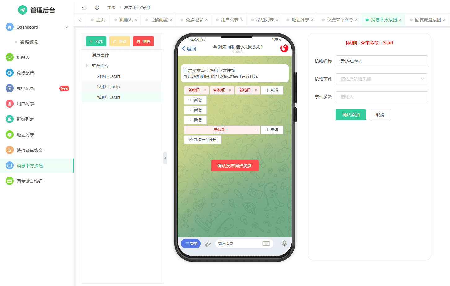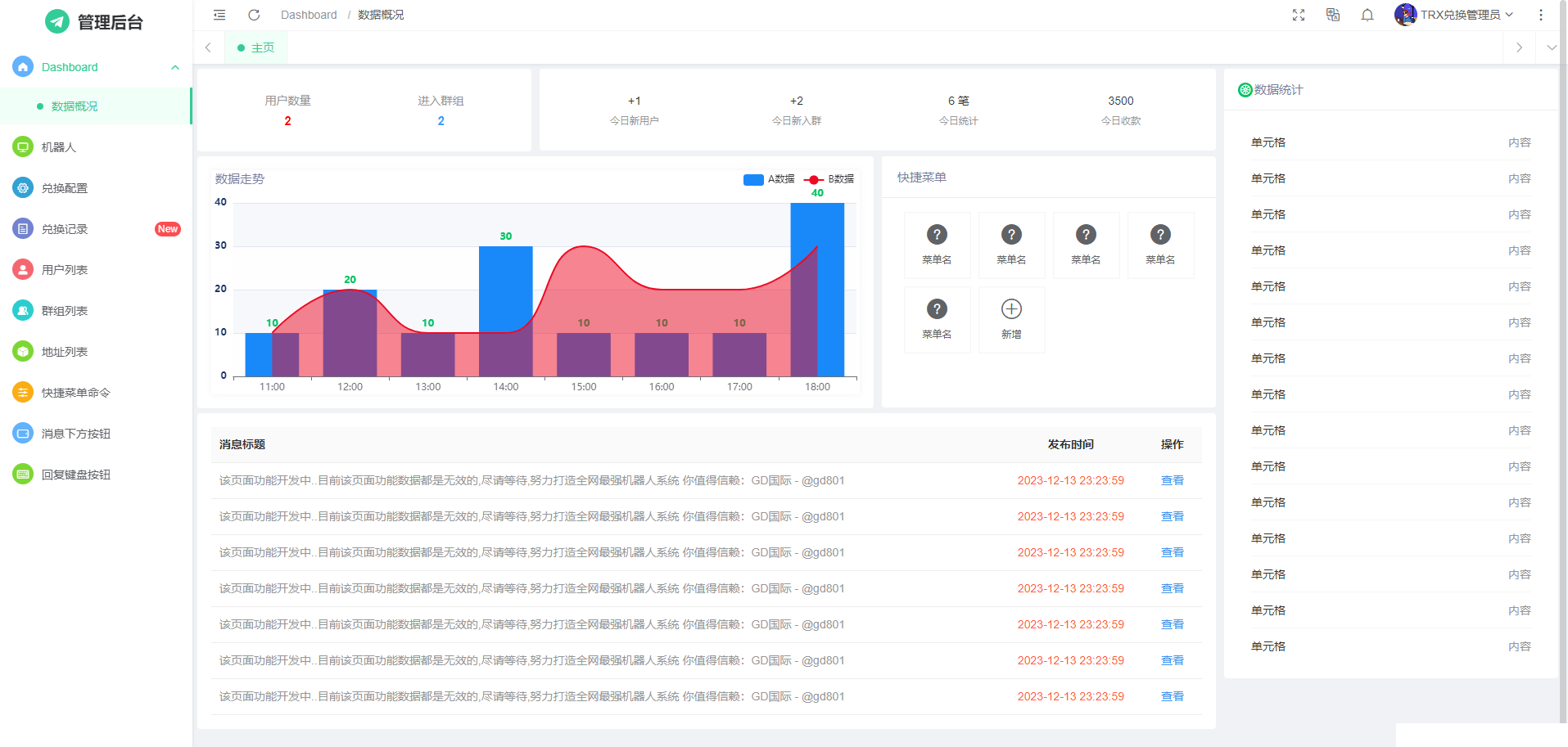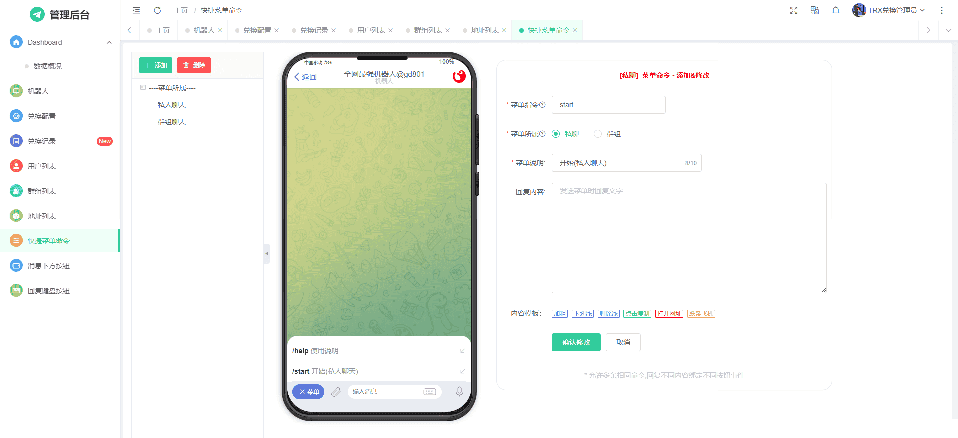 源码描述TRX自动兑换机器人,其实就是机器人框架,一个相当牛B的机器人框架,所有的机器人消息交互,都采用队列响应形式,支持高并发,高性能。你如果懂开发,可以很简单的使用这个框架,快速方便地开发任何机器人。本款机器人支持小程序,支持计算器,支持钱包地址查询,支持后台管理,以及支持后台可视化、自定义消息下发按钮、菜单命令、用户管理、群管理和推广返利等等。