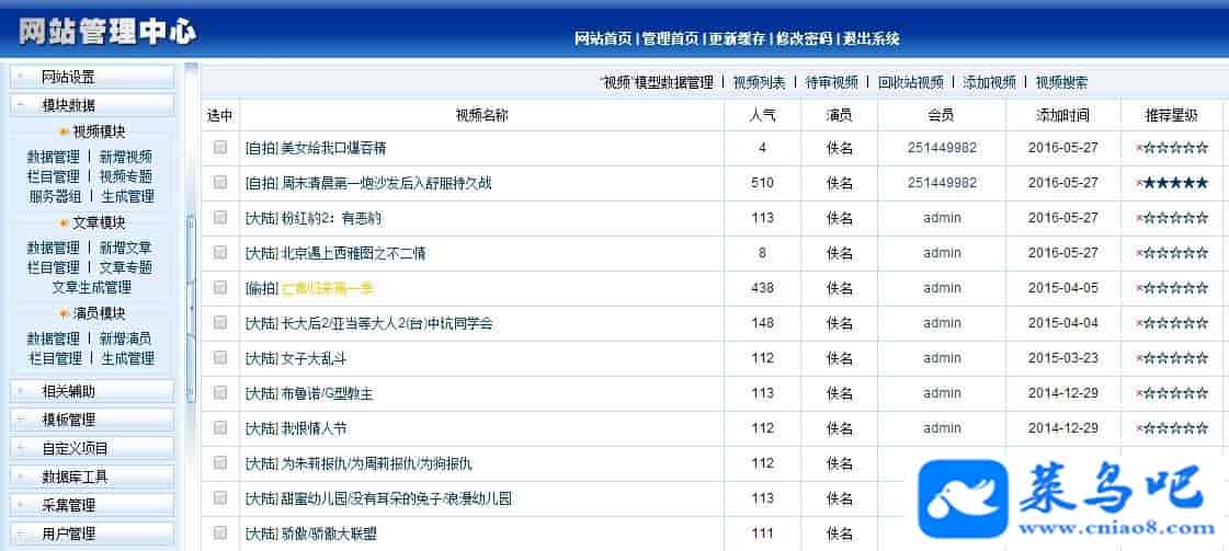电影站源码 福利源码,超级强大的一个视频系统!采用程氏Cscmsv3.5 GBK版本开发,整合ckplayer超酷网页视频播放器,带会员中心和手机版,用户可以上传视频投稿,可以设置下载扣费等,懂的人可以用他来盈利。源码包含火车头发布免登陆接口,写好采集规则分分钟就能建立一个大站。