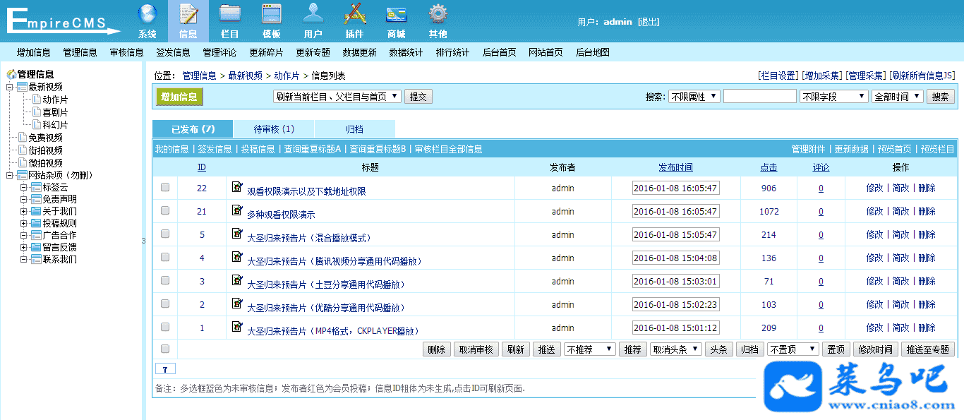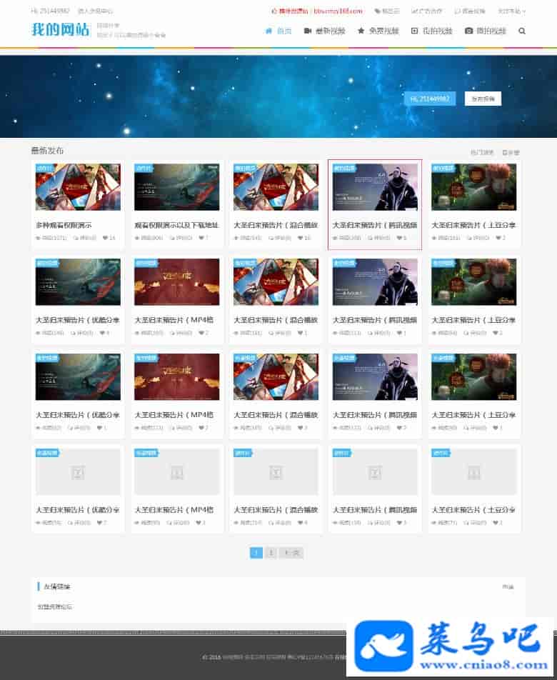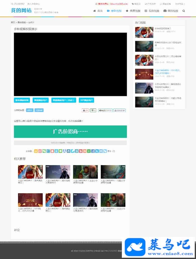 模板用帝国CMS最新版为核心。适合做视频播放和下载站点,默认可以播放优酷土豆腾讯等视频站点的视频(通用播放分享代码,非解析!),集成 CKPLAYER播放器,可以上传和外链自己的MP4、FLV格式的影片!自带帝国播放和下载权限,可以游客,普通用户,普通注册用户扣点和VIP包月包 年等权限播放和下载!自动响应各种平板手机移动设备!到手即可开站!