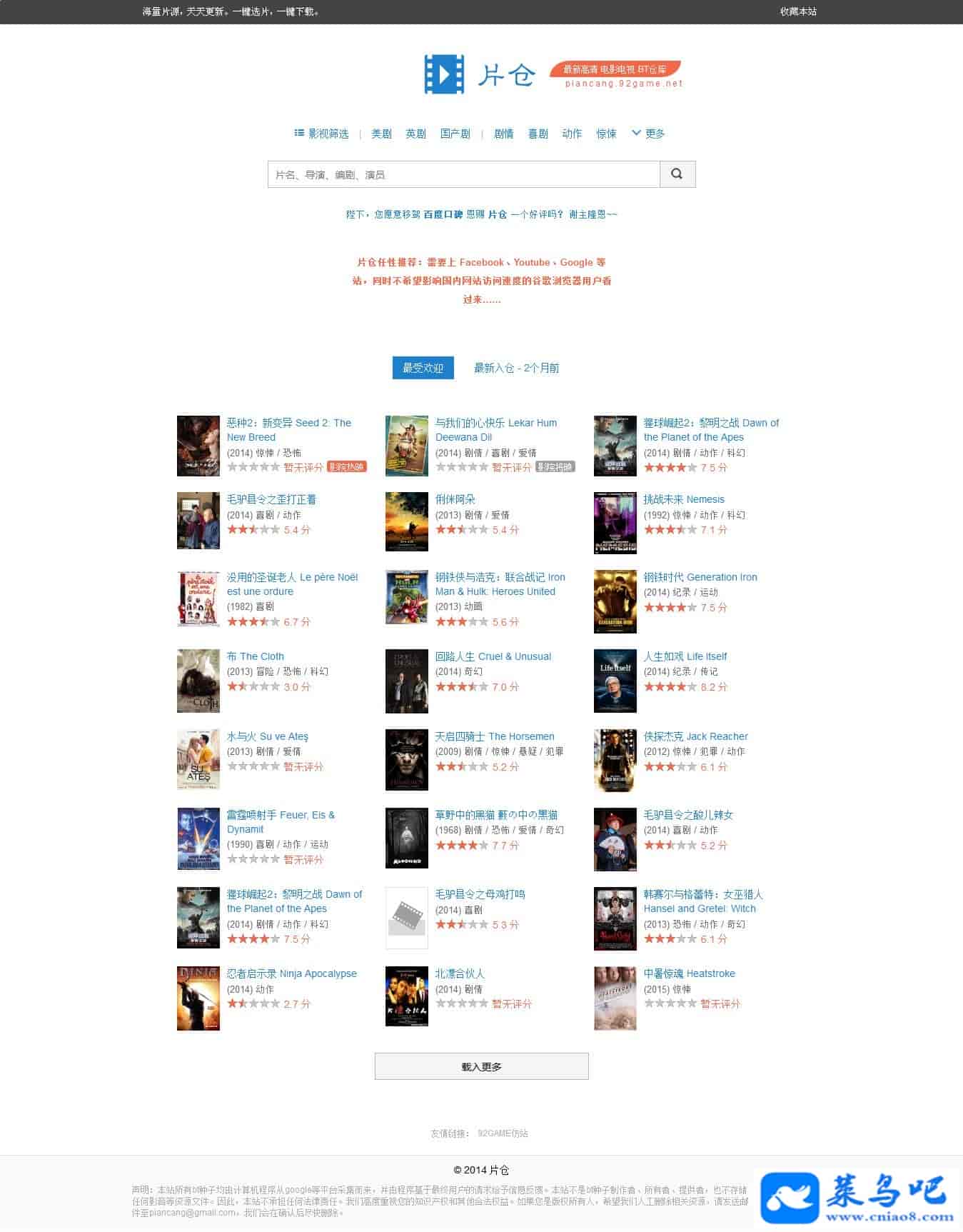 92GAME众筹定制《片仓》最新高清电影电视BT仓库,用户需求度高更新快,界面简洁用户体验好,自适应手机版。其他见安装说明吧。
