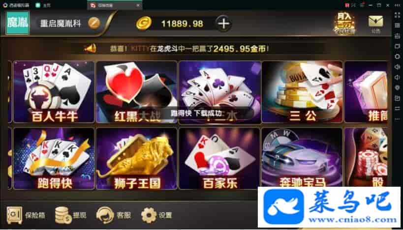游戏有:印尼分分菜、诃内五分菜、骰宝、龙虎斗、百家乐、炸金花、黑红大战、 百人牛牛、斗地主、牛牛、跑得快、