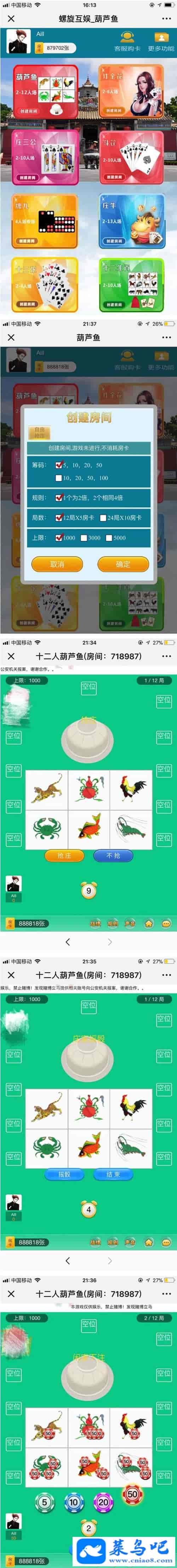 H5微信葫芦鱼棋牌游戏源码运营版,房卡模式玩法,支持手机微信登陆,附带后台管理系统,游戏平台含有多款游戏,分别为葫芦鱼、炸金花、庄三公、斗篷、牌九、庄牛、十三张、十二生肖。搭建准备配置:liunx Nginx php mysql 服务公众号 备案域名