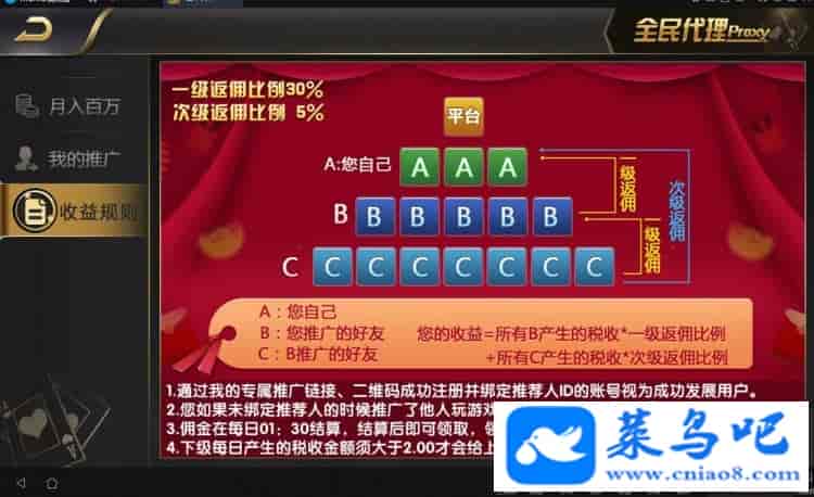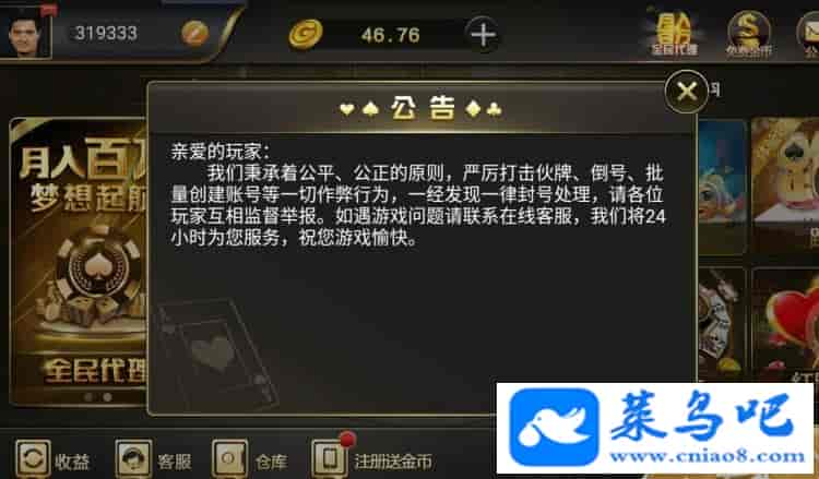 本套游戏是网狐二开的,控制稳定,代理稳定,游戏稳定,经过实际运营,市场反响和实际运营效果很不错。游戏界面精美细腻,子游戏均为市场热门游戏,增加高热度海外子游戏轮盘等,更是为这款棋牌产品添加了一些高端的逼格和可玩性,可以有效提高玩家兴趣度和粘度,全民代理的三级分销模式,可以大大的减少你运营的推广成本,也可以让快速吸取一大批玩家,前端可直接佣金提现,让玩家推广的兴趣度更高。