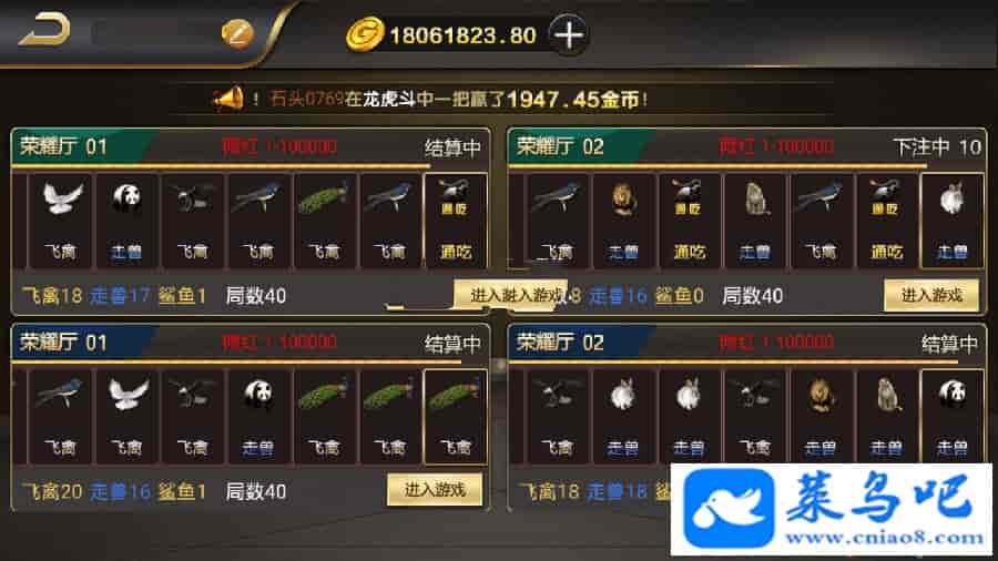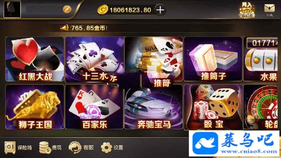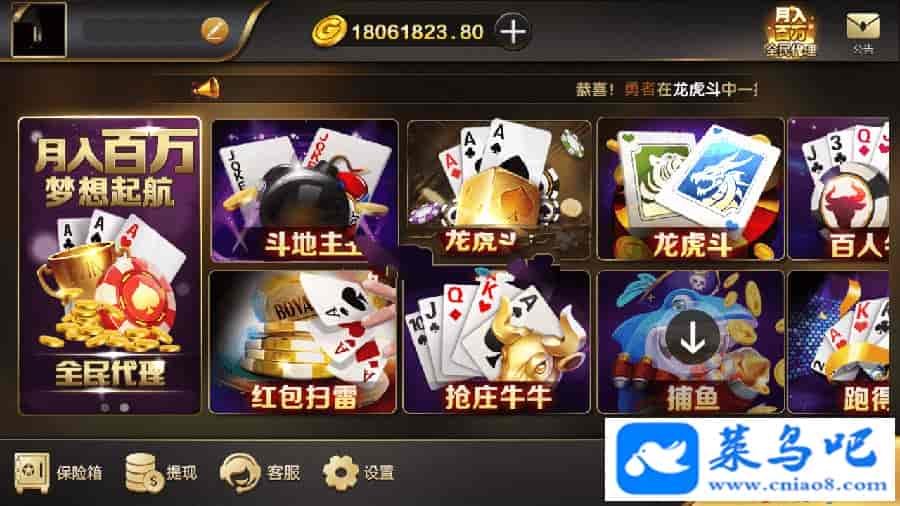 游戏有:斗地主、炸金花、龙虎斗、百人牛牛、红包扫雷、捕鱼、跑的快、狮子王国、红黑大战、十三水、百家.乐、奔驰宝马、三公、推筒子、筛宝、水果机、轮盘