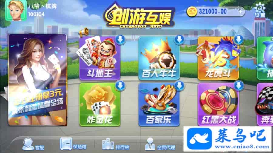 创游互娱页面设计亮丽,与卡布是一个家族。游戏包含:牛牛,红黑大战,奔驰宝马,捕鱼,龙虎,炸金花。