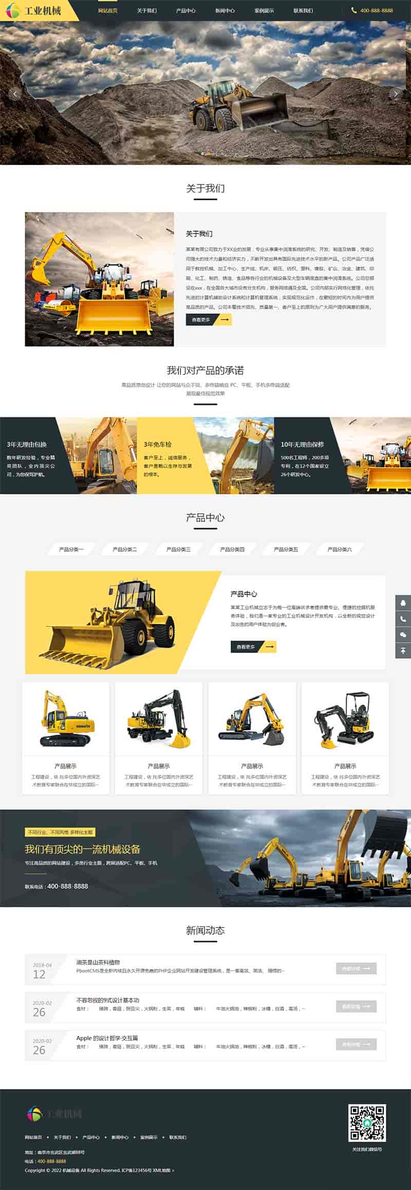 (自适应手机端)响应式挖掘机设备pbootcms网站模板 黄色大型采矿设备网站源码下载PbootCMS内核开发的网站模板,该模板适用于挖掘机网站、采矿设备网站等企业,当然其他行业也可以做,只需要把文字图片换成其他行业的即可;自适应,同一个后台,数据即时同步,简单适用!附带测试数据!友好的seo,所有页面均都能完全自定义标题/关键词/描述,PHP程序,安全、稳定、快速;用低成本获取源源不断订单!后台:域名/admin.php