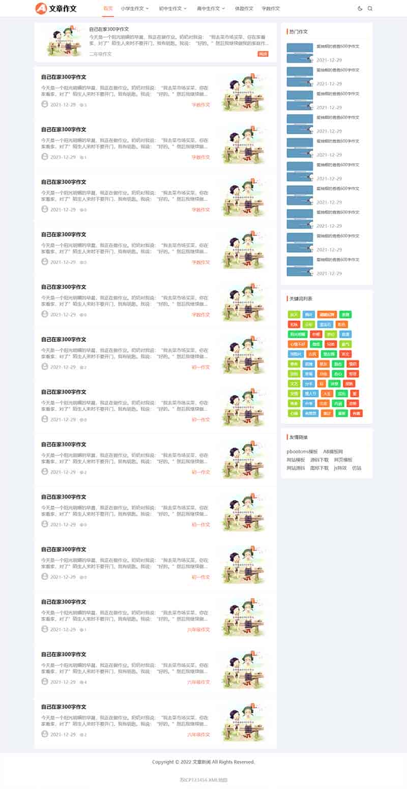 (自适应手机端)响应式小学初中作文网站pbootcms模板 文章资讯论文作文个人博客网站源码下载PbootCMS内核开发的网站模板,该模板适用于作文网站、文章资讯网站等企业,当然其他行业也可以做,只需要把文字图片换成其他行业的即可;自适应,同一个后台,数据即时同步,简单适用!附带测试数据!友好的seo,所有页面均都能完全自定义标题/关键词/描述,PHP程序,安全、稳定、快速;用低成本获取源源不断订单!后台:域名/admin.php