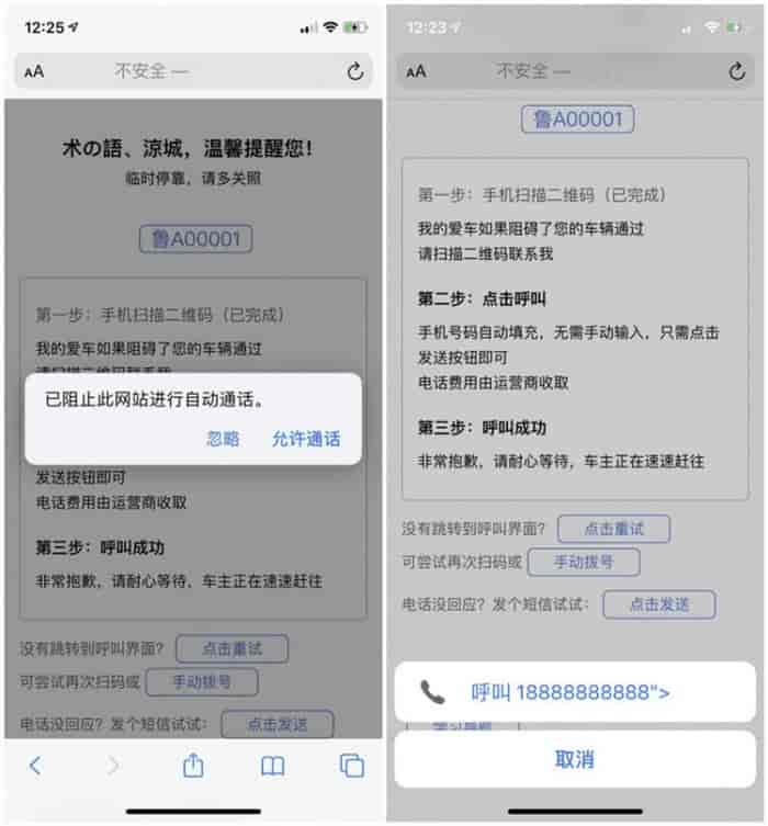 临时停车自动拨号和自动发短信html源码分为两套源码,检测到手机打开才会自动弹出
