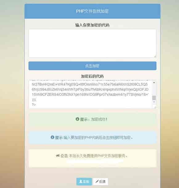 PHP文件在线加密源码,建议只加密核心文件就好了,全文件加密的话可能会导致文件过大。安装方法:修改ini.php文件内容,上传到主机解压访问域名即可