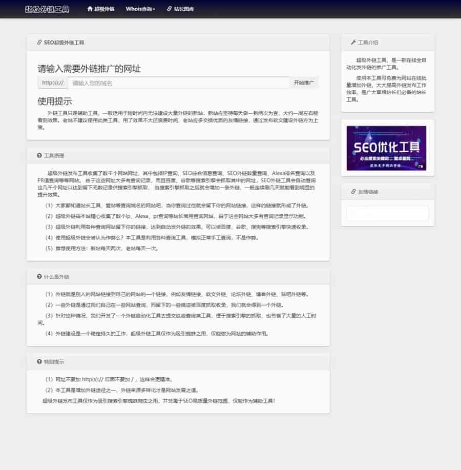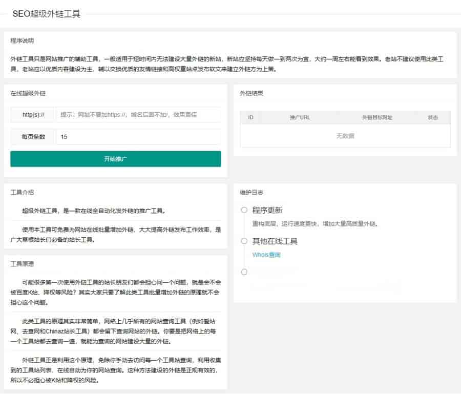 外链工具只是网站推广的辅助工具,一般适用于短时间内无法建设大量外链的新站,新站应坚持每天做一到两次为宜,大约一周左右能看到效果。老站不建议使用此类工具,老站应以优质内容建设为主,辅以交换优质的友情链接和高权重站点发布软文来建立外链方为上策