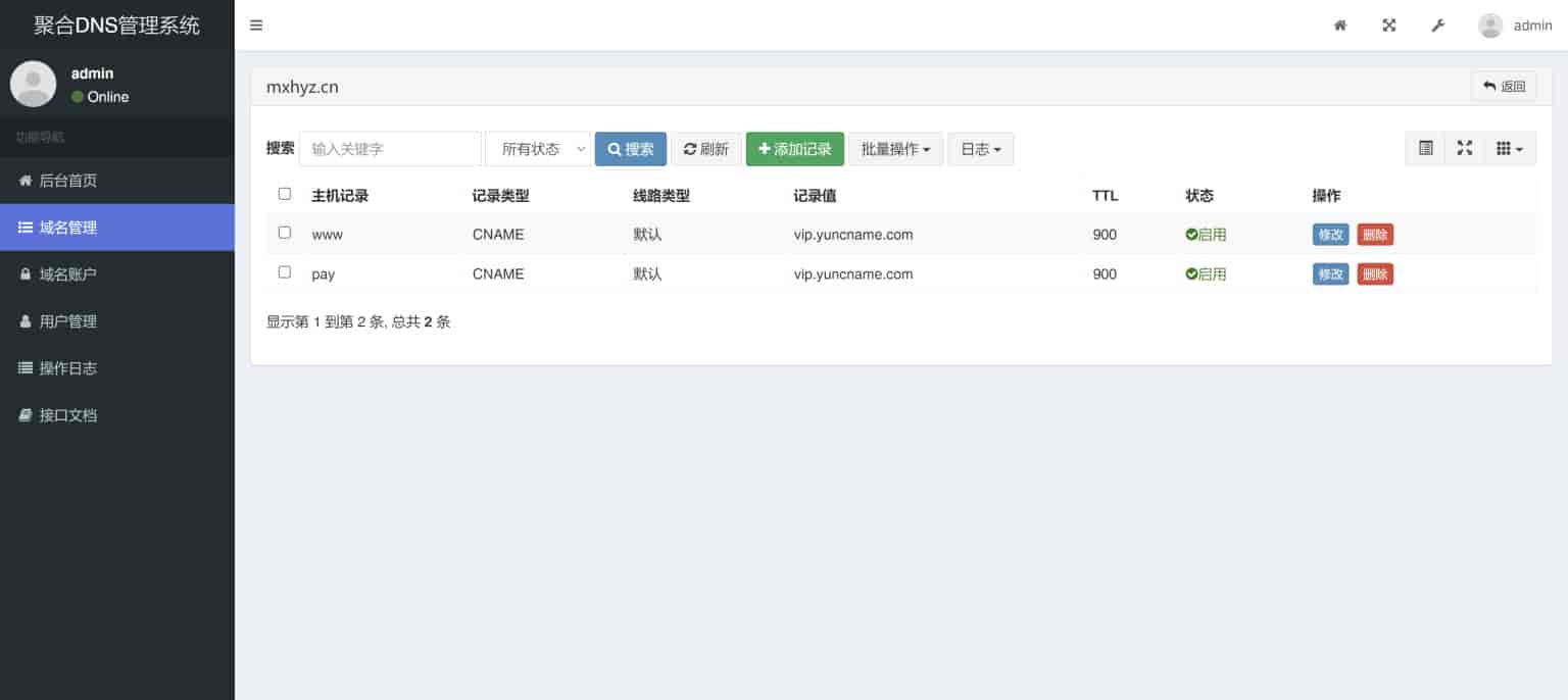 聚合DNS管理系统可以实现在一个网站内管理多个平台的域名解析,目前已支持的域名平台有:阿里云、腾讯云、华为云、西部数码、CloudFlare。本系统支持多用户,每个用户可分配不同的域名解析权限;支持API接口,支持获取域名独立DNS控制面板登录链接,方便各种IDC系统对接。