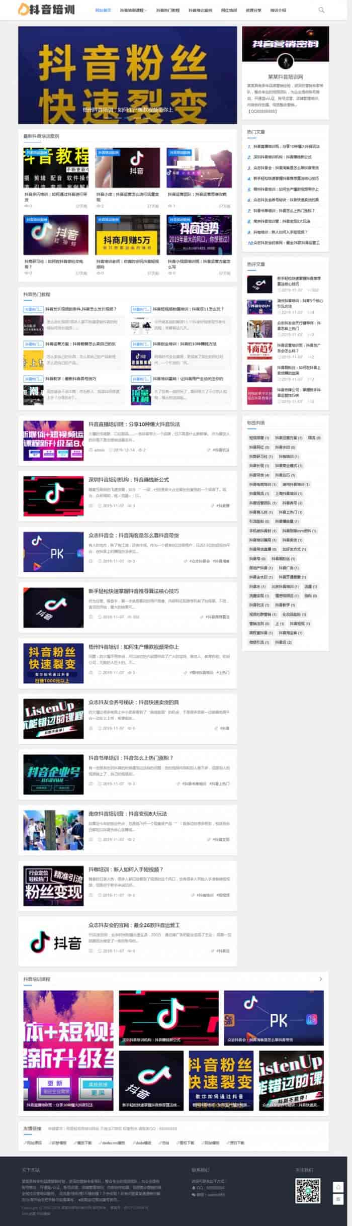 织梦dedecms响应式抖音培训课程新闻资讯类网站模板(自适应手机移动端)本套织梦模板采用织梦最新内核开发的模板,这款模板使用范围极广,不仅仅局限于一类型的企业,课程培训、新闻资讯网、抖音培训类的网站都可以用该模板。你只需要把图片和文章内容换成你的即可,颜色都可以修改,改完让你耳目一新的感觉!布局规整,利于用户体验,手工书写DIV+CSS,代码精简。