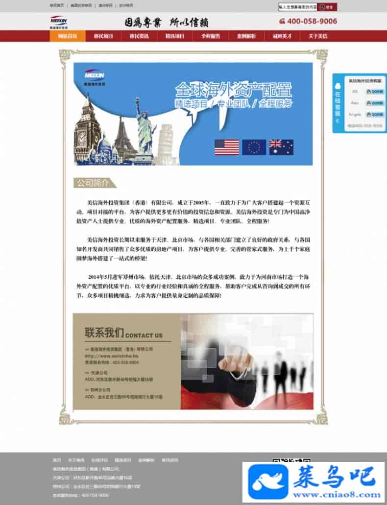 2、相当简洁大气高端,模板简单,全部已数据调用,只需后台修改栏目名称即可 3、适用于地产投资管理咨询公司、管理工作室;4、网站手工DIV+css,代码精简,首页排版整洁大方、布局合理、利于SEO、图文并茂、静态HTML;5、首页和全局重新做了全面优化,方便大家无缝使用; 使用程序:织梦DEDECMS5.5以上版本都可以使用。