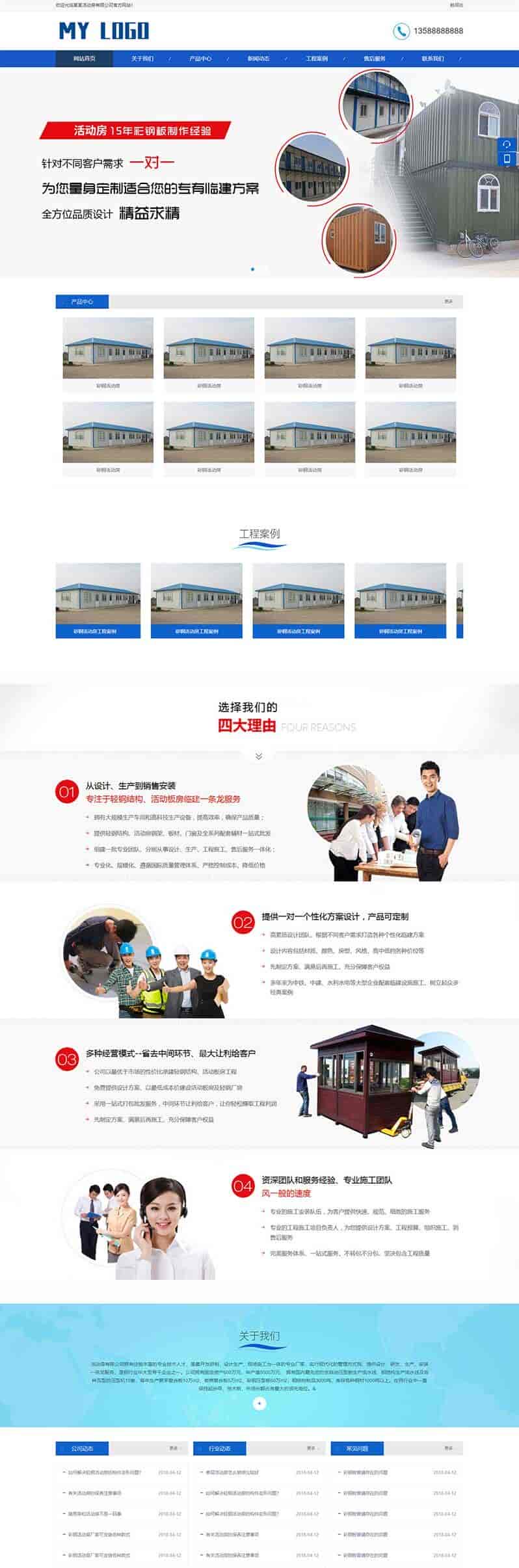 (PC+WAP)蓝色彩钢板活动房网站pbootcms模板 临时移动房网站源码下载响应式端同一个后台,数据即时同步,简单适用!附带测试数据!完美的seo,所有页面均都能完全自定义标题/关键词描述,PHP程序,安全、稳定、快速;