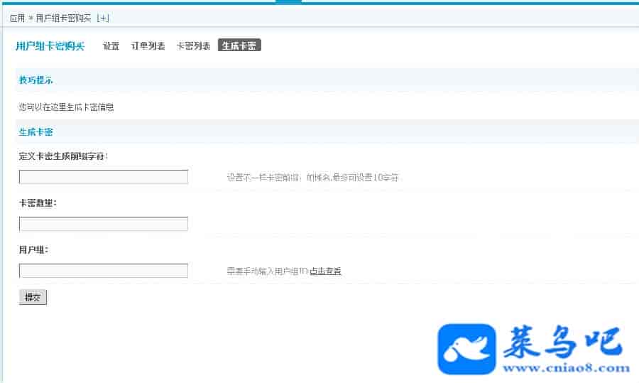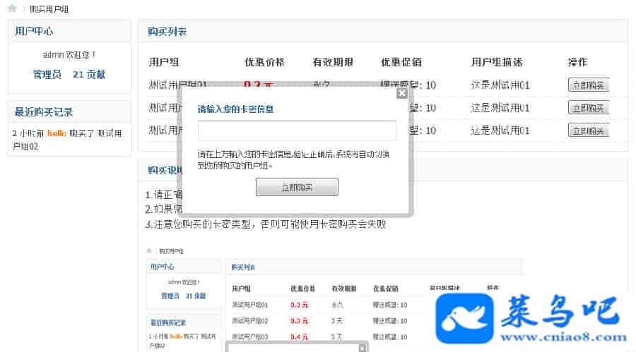 2.用户输入在第三方平台购买的卡密信息,即可购买成功自动开通用户组。