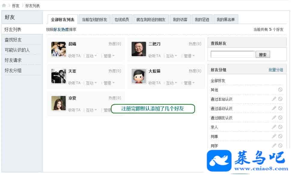 启用本插件后,当新用户注册网站时,会自动添加一批预定义的好友到新用户好友列表里。方便好友之间互动,提高论坛人气。