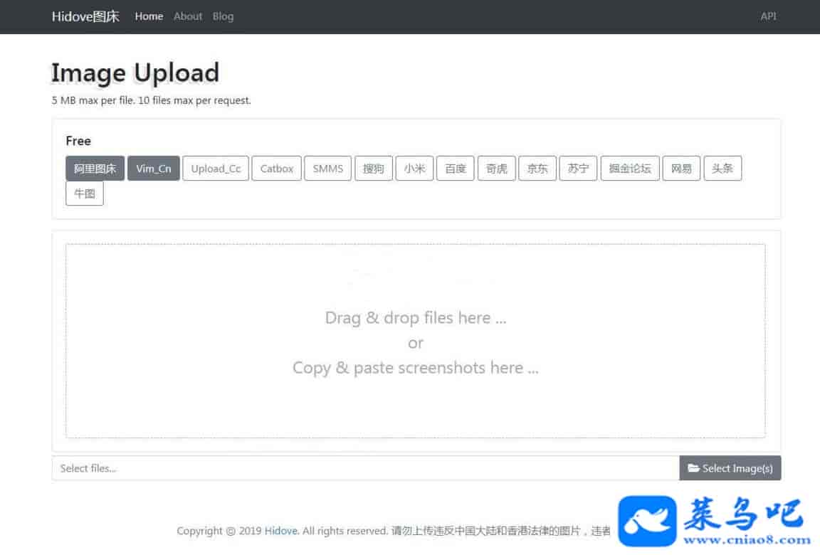 Hidove在线聚合图床网站源码,支持15个接口自由更换,接口均可在前台修改,直接上传网站访问即可使用,bootstrap4简约界面。特点