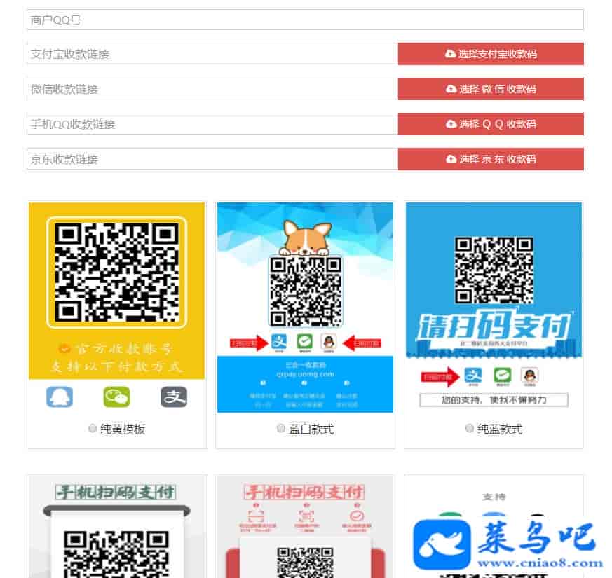 20个模板,四个平台,支持wx、支付宝、QQ、京东,四合一收款。