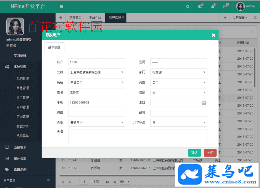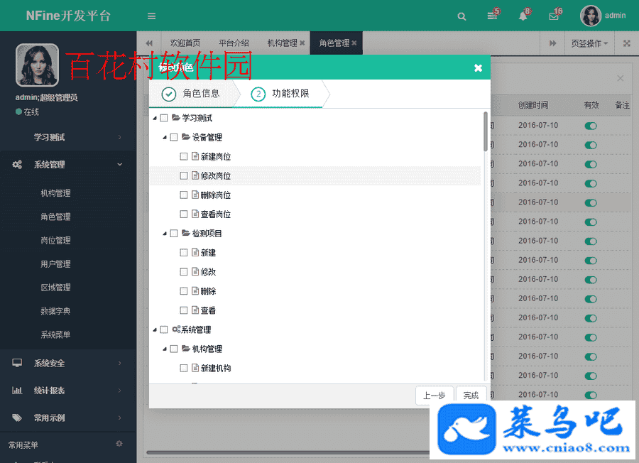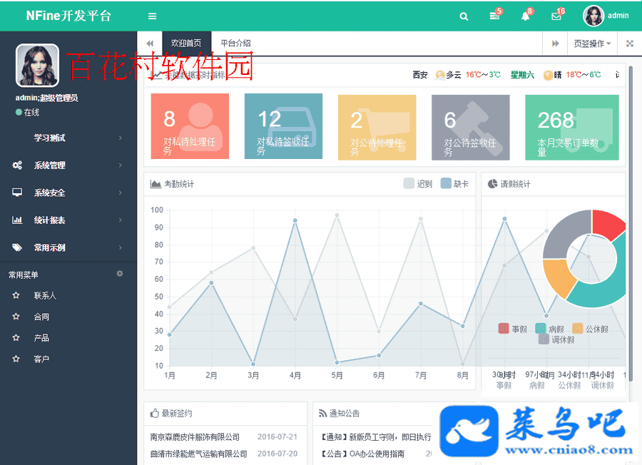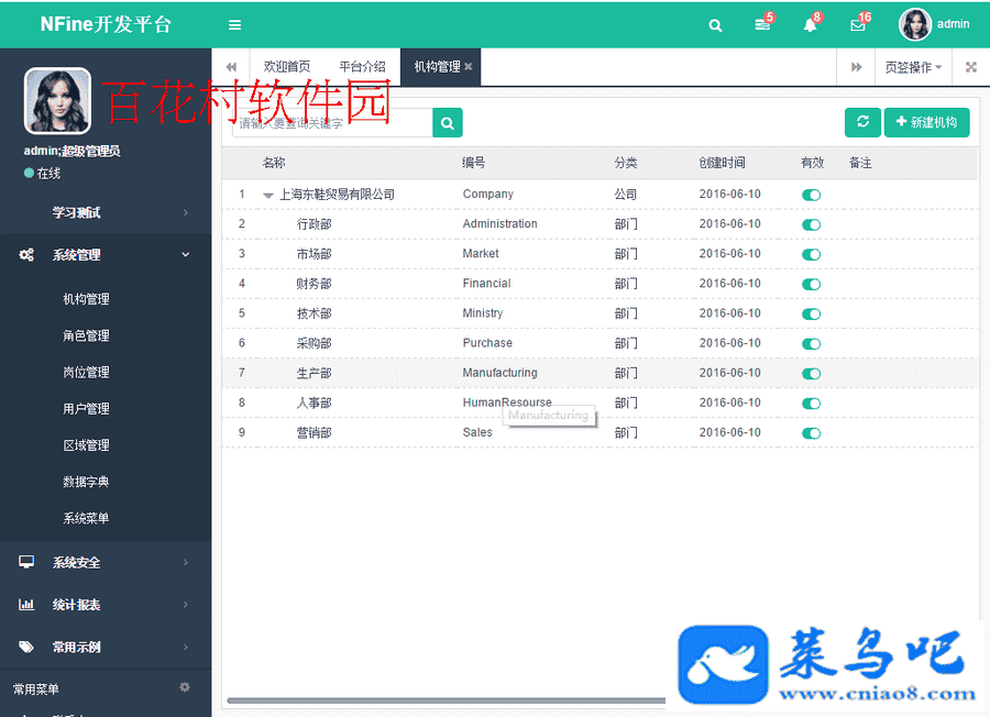NFine是基于C#语言的极速WEB+ORM框架,其核心设计目标是开发迅速、代码量少、学习简单、功能强大、轻量级、易扩展,让Web开发更迅速、简单。能解决60%重复工作。为您节约更多时间,去陪恋人、家人和朋友。轻松开发,专注您的业务,从NFine开始。