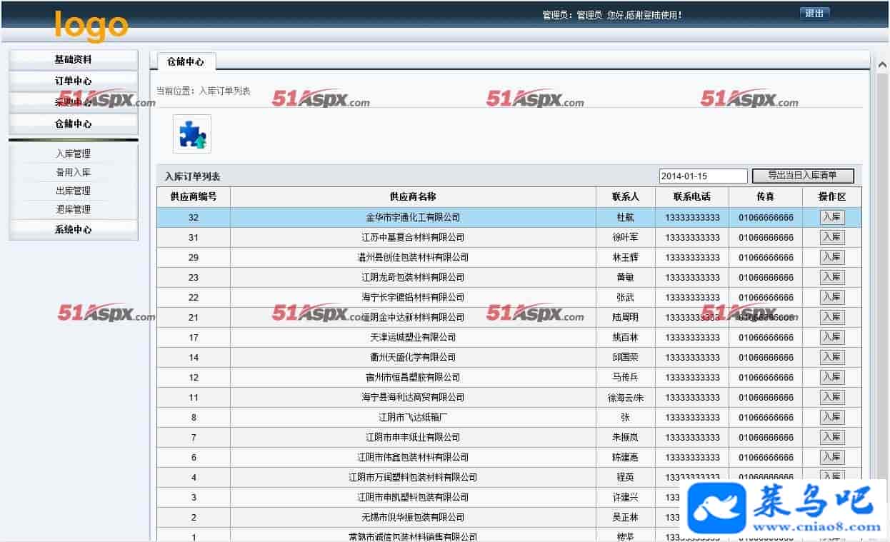 仓储中心:入库管理 备用入库 出库管理 退库管理