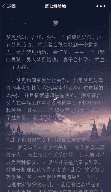 周公解梦是靠人的梦来卜吉凶的一本于民间流传的解梦书籍,共有七类梦境的解述。而周公解梦微信小程序实例源码则是通过简洁大气的前端界面,输入梦见关键词,即可调用数据,实现解梦的实例源码。