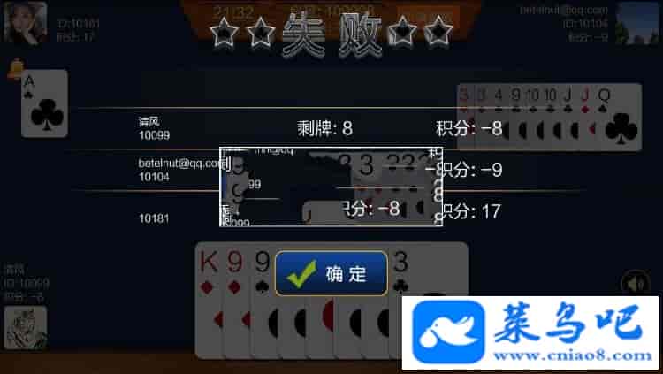 本游戏的牌点由大到小排列为:大王、小王、2、A、K、Q、J、10、9、8、7、6、5、4、3;