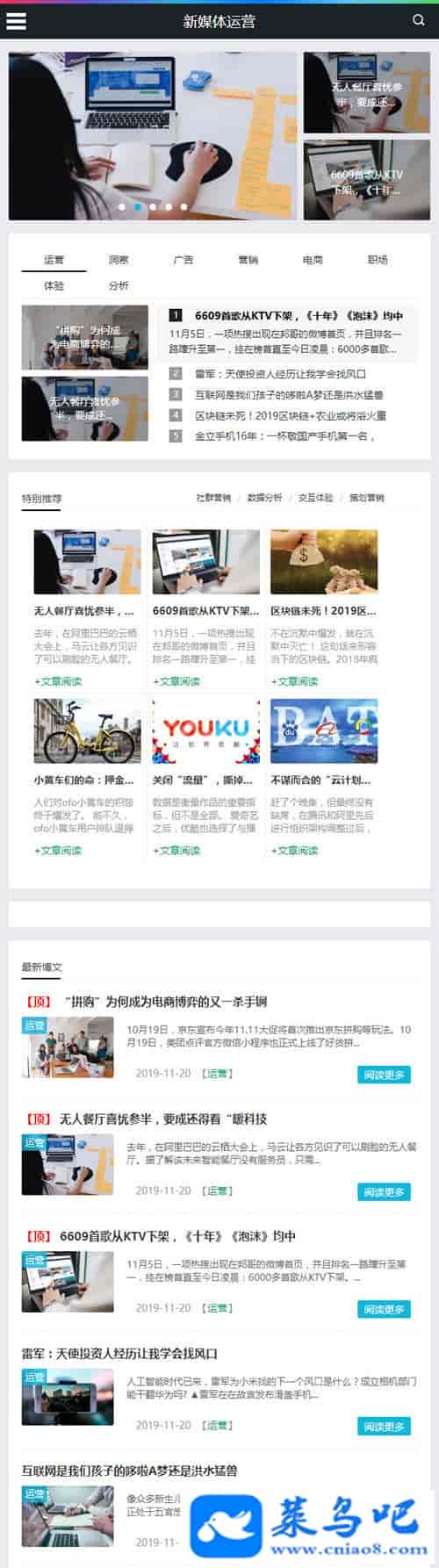 织梦dedecms响应式新媒体运营资讯类网站模板(自适应手移动端)本套织梦模板采用织梦最新内核开发的模板,这款模板使用范围极广,不仅仅局限于一类型的企业,科技资讯、新媒体html5运营资讯类的网站都可以用该模板。你只需要把图片和文章内容换成你的即可,颜色都可以修改,改完让你耳目一新的感觉!布局规整,利于用户体验,手工书写DIV+CSS,代码精简。