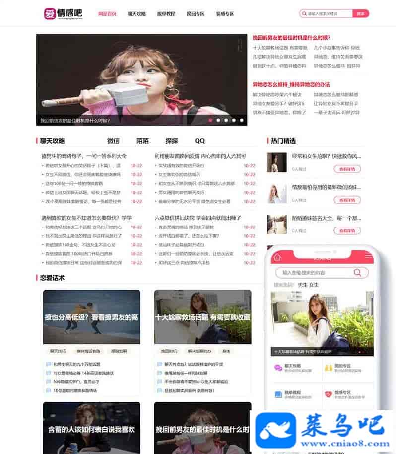 织梦dedecms粉色风格情感资讯文章类网站模板(带手机移动端)织梦最新内核开发的模板,该模板属于情感博客、撩妹博客、新闻资讯类网站,