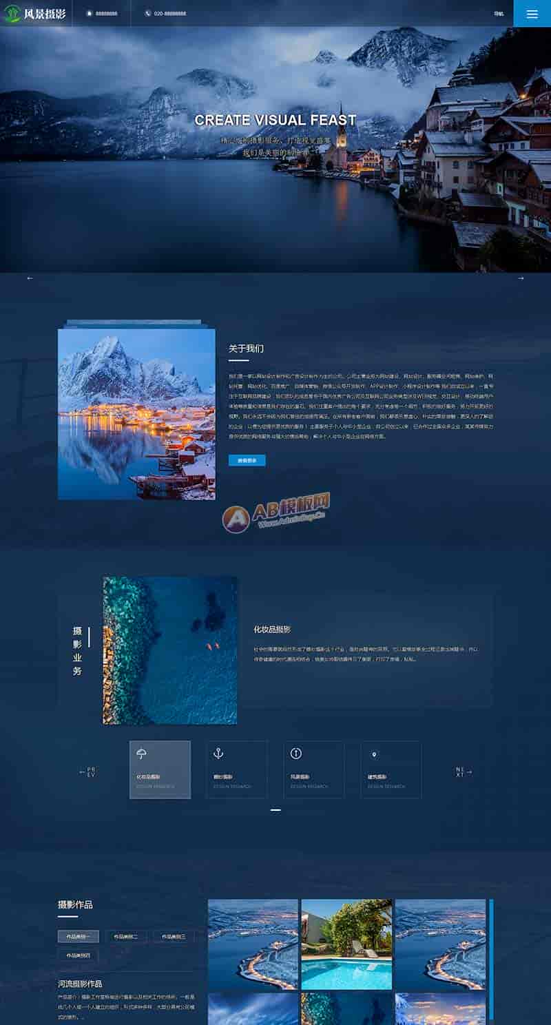 (自适应手机端)深蓝色风景摄影网站pbootcms模板 户外风景摄影机构网站源码下载PbootCMS内核开发的网站模板,该模板适用于风景摄影网站、摄影机构网站等企业,当然其他行业也可以做,只需要把文字图片换成其他行业的即可;响应式,同一个后台,数据即时同步,简单适用!附带测试数据!友好的seo,所有页面均都能完全自定义标题/关键词/描述,PHP程序,安全、稳定、快速;用低成本获取源源不断订单!后台:域名/admin.php