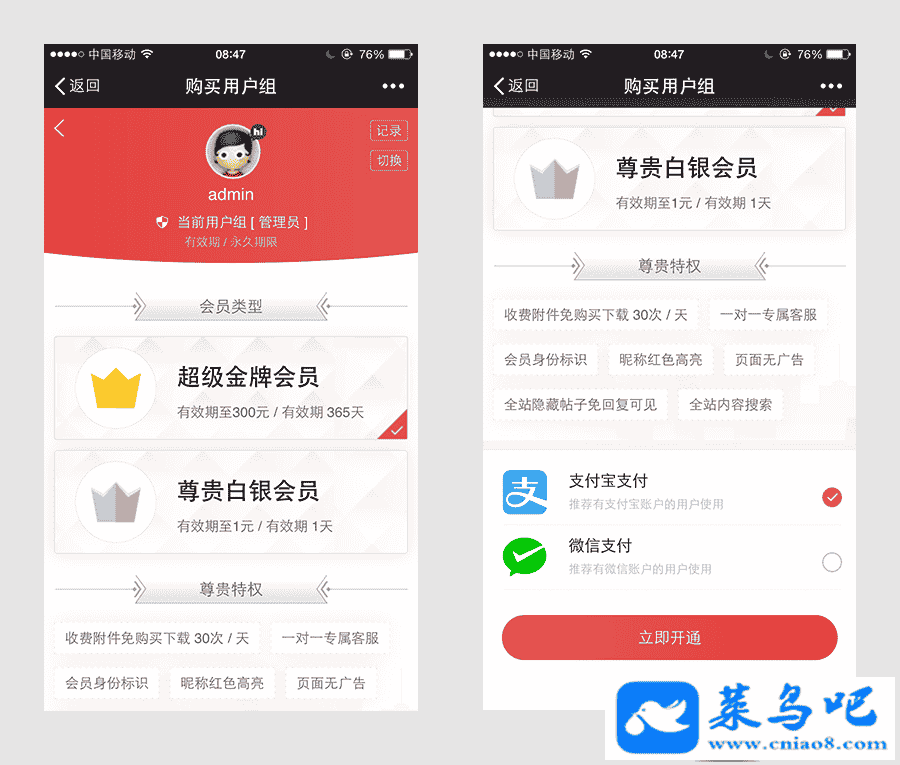 支持支付宝,微信付款方式实现会员用户组购买