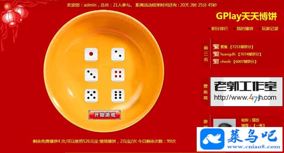 GPlay天天博饼是一款简单的娱乐游戏。可以独立开展活动玩法,完全自定义展示风格等。摇动6粒骰子,摇中相应的奖项可获得相应的博饼分和任意设置的论坛积分。