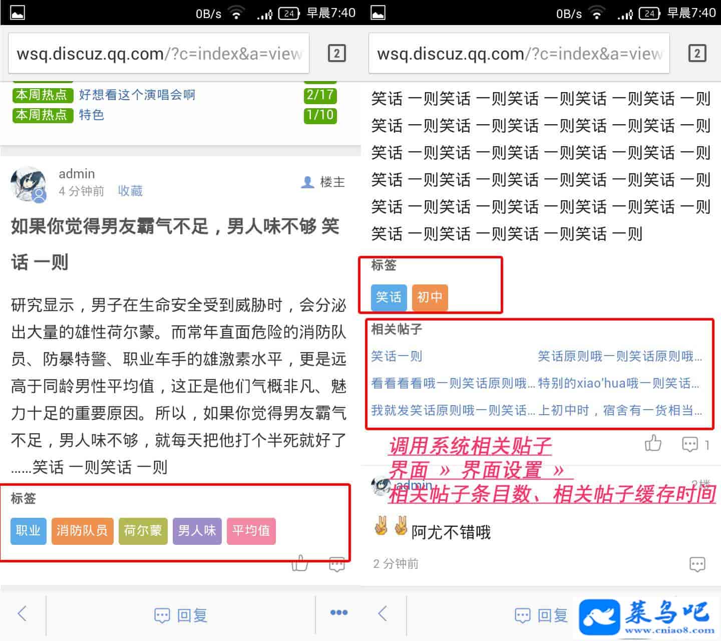 可任意组合想显示的版块在首页显示,可以在内容页显示标签、相关帖子。