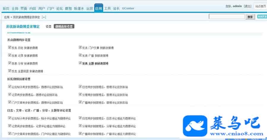 二、绑定微博用户论坛、群组发帖、回帖、门户文章、家园广播、分享、记录、日志等同步新浪微博,图片也可以同步。