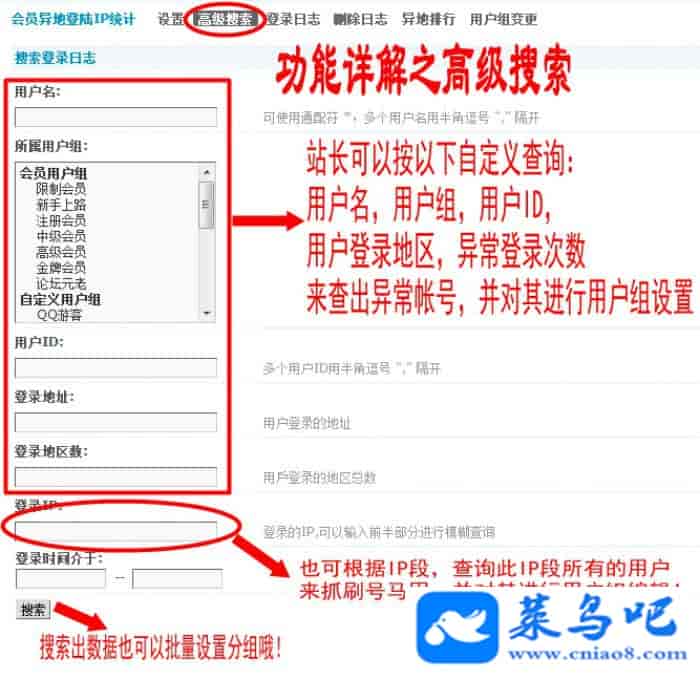 站长也可以根据IP段,查询此IP段所有的用户,来抓刷号马甲,并对其进行用户组编辑!