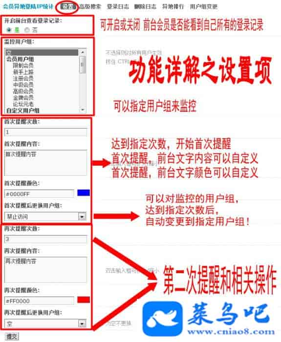 首次提醒次数,首次提醒文字内容,首次提醒文字颜色,首次提醒后更换用户组(站长设置第一次异地登录提醒,自定义文字和颜色,并可以自动设置是否自动更换用户组)