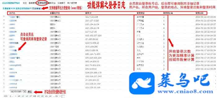站长后台可以查看用户登陆详细日志(登陆时间,登陆地点,异地登陆次数),并可对任何一个用户进行手动用户组修改