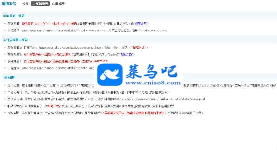 3、二维码说明:关于二维码获取和上传问题请仔细阅读插件后台“二维码设置”相关说明,如有不懂请百度相关问题,插件作者不再为此类问题做解答!
