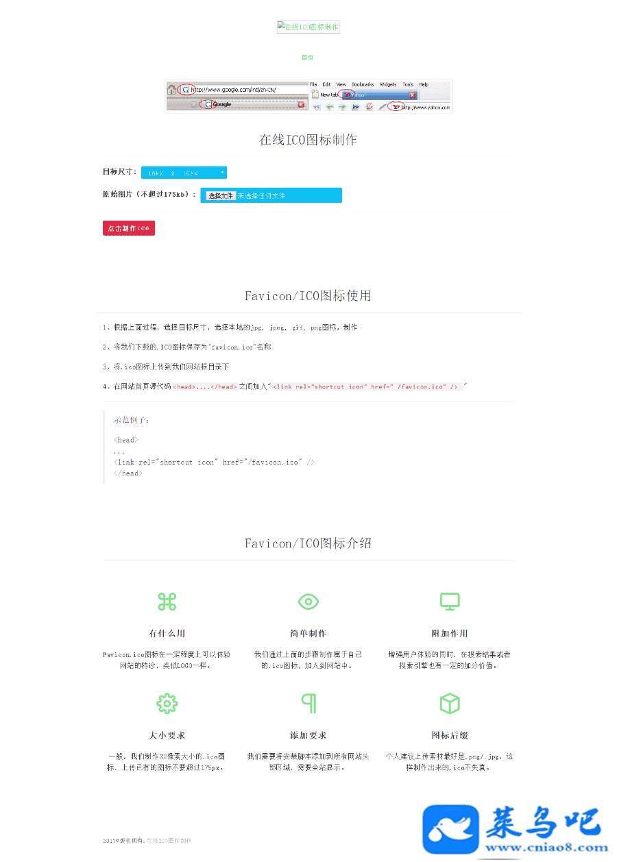 所谓favicon,即Favorites Icon的缩写,顾名思义,便是其可以让浏览器的收藏夹中除显示相应的标题外,还以图标的方式区别不同的网站。当然,这不是Favicon的全部,根据浏览器的不同,Favicon显示也有所区别:在大多数主流浏览器如FireFox和Internet Explorer (5.5及以上版本)中,favicon不仅在收藏夹中显示,还会同时出现在地址栏上,这时用户可以拖曳favicon到桌面以建立到网站的快捷方式;除此之外,标签式浏览器甚至还有不少扩展的功能,如FireFox甚至支持动画格式的favicon等。